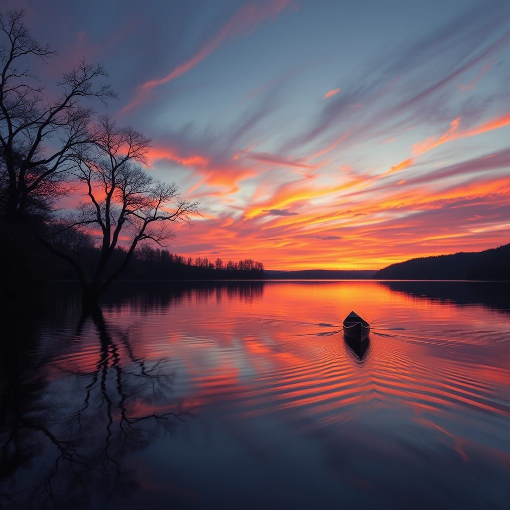 A serene image of a lake at sunset with silhouetted trees reflected in the water. The color palette evokes luminism, with a canoe creating ripples on the tranquil water.
