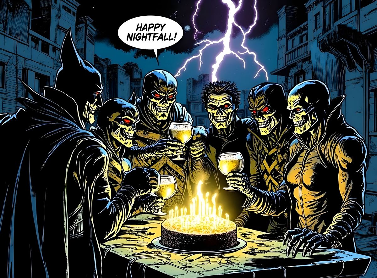 spooky superhero birthday party in a crumbling city rooftop, comic-book art style with dynamic shadows and halftone texture, masked heroes and skeleton villains clinking glasses, glowing cake shaped like a reactor core, lightning striking behind them, speech bubbles saying “Happy Nightfall!” and “You survived another year!”, vibrant comic tones, detailed inked panels, dramatic energy negative prompt: sketchy lines, low contrast, messy composition, realism, washed-out colors, 3D render