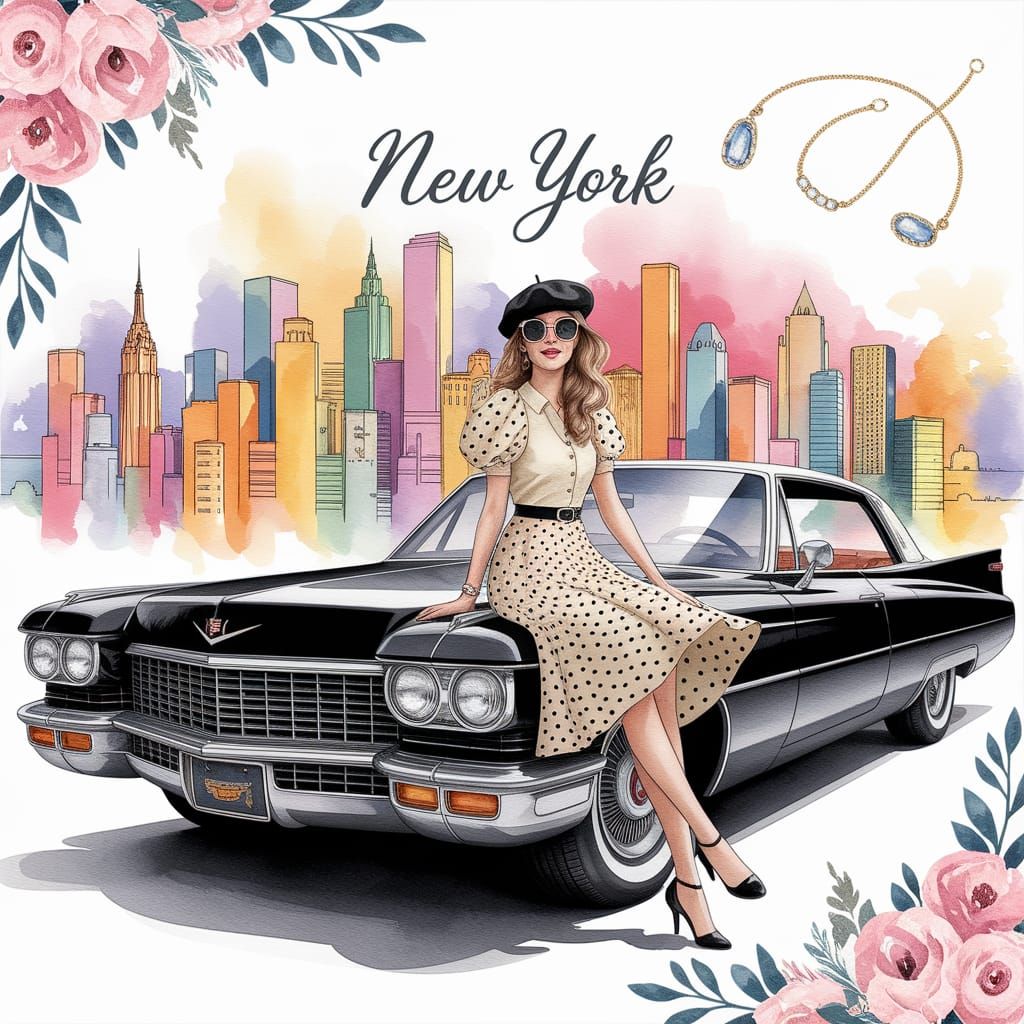 A watercolor painting of a stylish woman in a polka-dot skirt and beret, posing on a vintage black Cadillac with a soft New York skyline. Delicate florals add to the whimsical scene.
