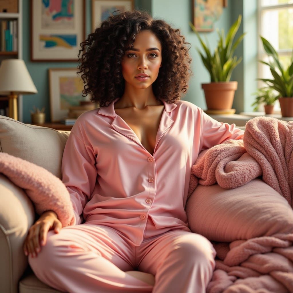 This image captures a serene moment of a woman in cozy pink pajamas, her dark curly hair blown by the wind, as she lounges on a retro sofa in a hyper-realistic style reminiscent of vintage photography and Art Nouveau influences.