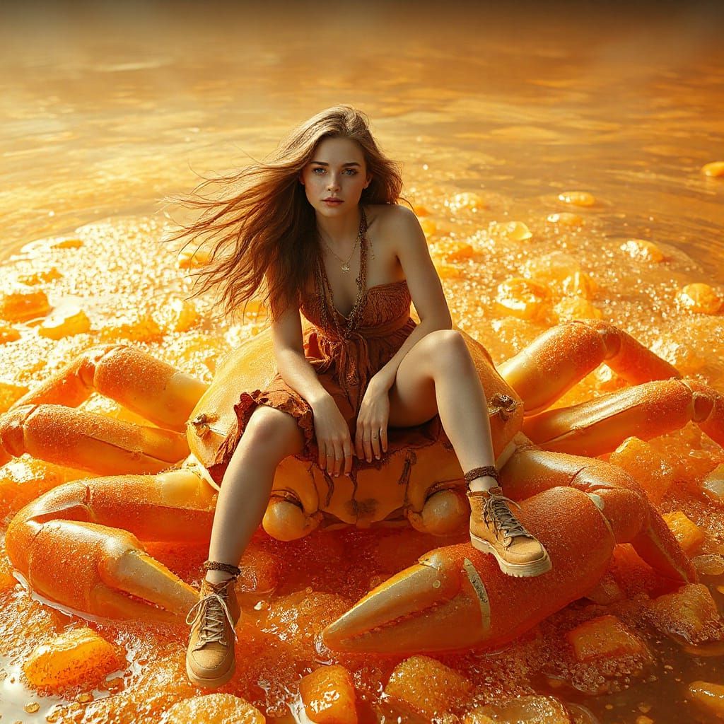 A woman with golden hair in bohemian clothes sits on a giant gummy crab in a surreal sea of soda. The art style blends neon futurism, eerie mist, and whimsical lines with soft lighting.