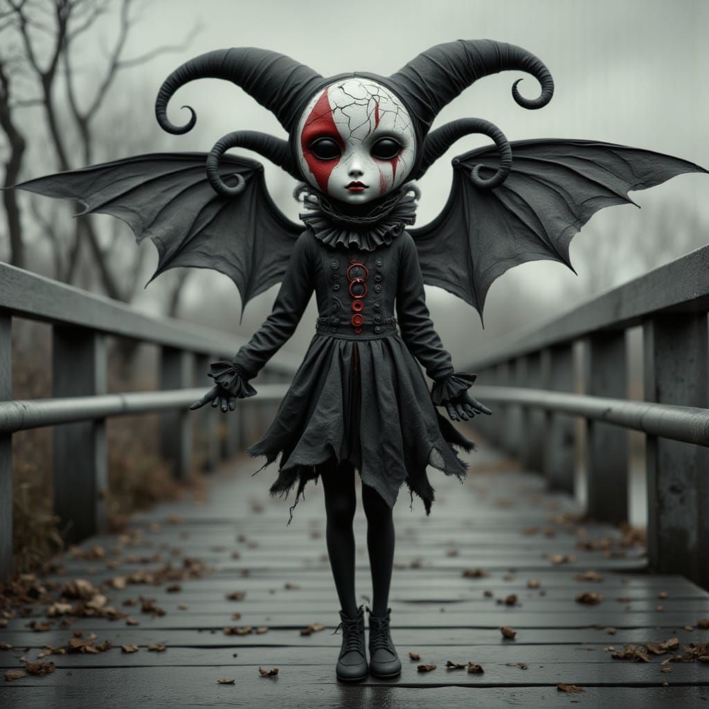 This surreal image shows a jester ballerina with a cracked mask and a red tear, dancing on a bridge in deep, contrasting colors under overcast skies, evoking feelings of disappointment.