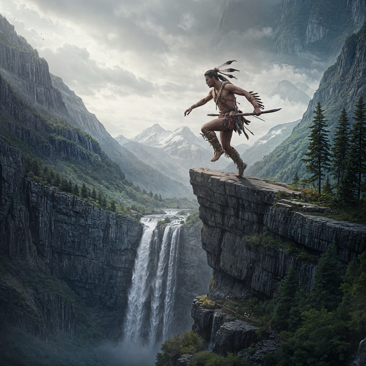 A dramatic image of a Native American warrior jumping from a mountain near a waterfall. The scene is reminiscent of 19th-century historical paintings with cinematic lighting.