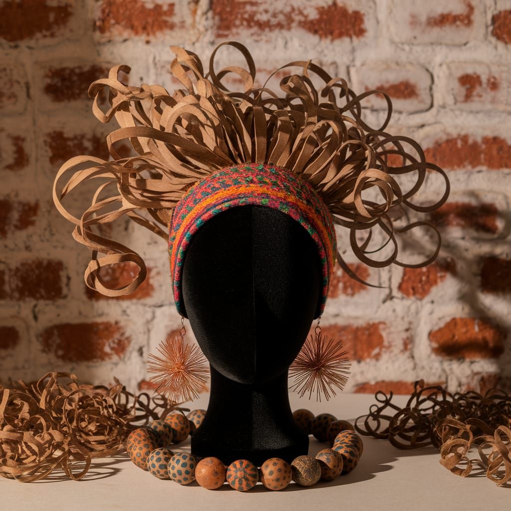 A striking picture of a mannequin head against whitewashed bricks. The head is adorned with curly wood shavings, a colorful felt headband, copper wire earrings, and a patterned clay bead necklace. The image emphasizes texture and light.