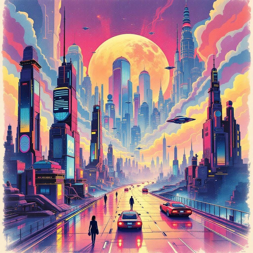 This image shows a vibrant, retro-futuristic cityscape with neon lights and flying cars. The design is evocative of 1980s airbrush art, featuring bold colors and smooth gradients in a pop art style.
