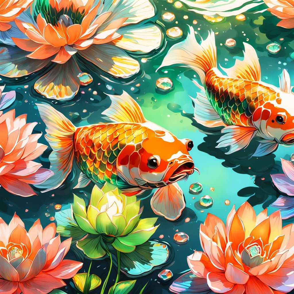 This image shows a koi fish swimming in a pond. The fish is colored in neon shades of green and orange, and the pond is filled with lotus flowers. The image is rendered as highly detailed digital art.
