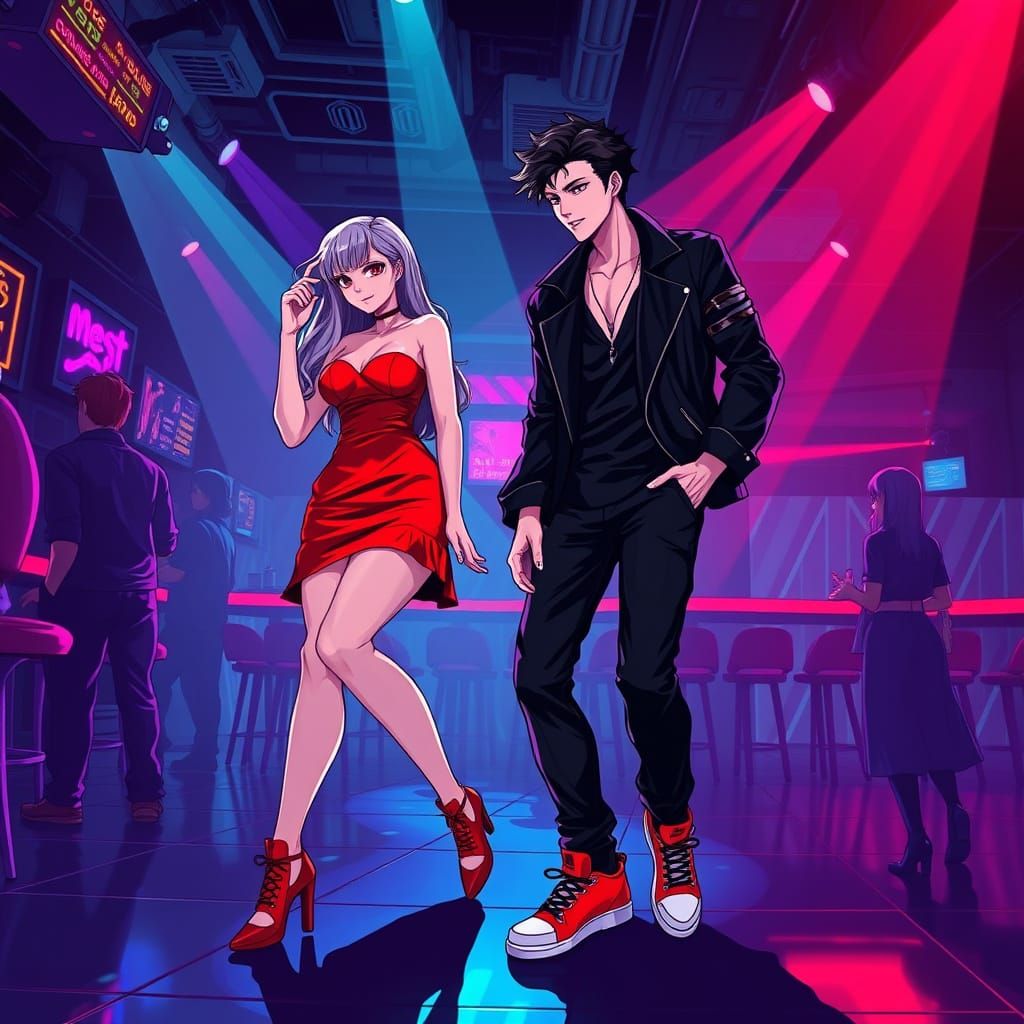 A vibrant nightclub scene featuring a young vampire and stunning companion, set against a backdrop of neon lights, bold lines, and rich hues, reminiscent of anime and manga art styles.