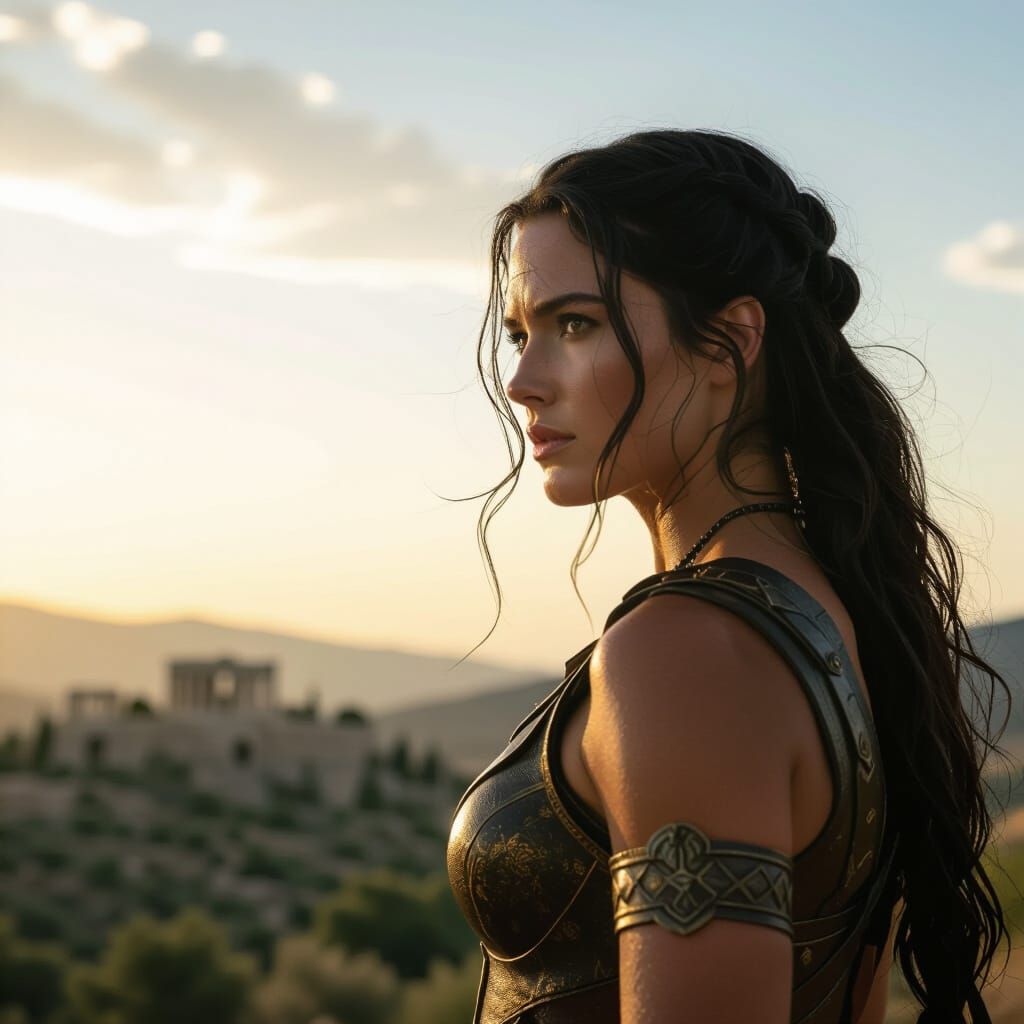 This image shows a warrior princess gazing over an ancient Greek landscape at dusk. The scene is reminiscent of a cinematic film still with atmospheric lighting and a dramatic, epic feel.