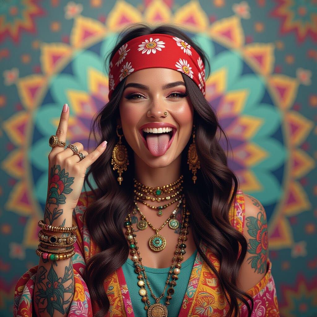 A portrait of a vibrant hippie woman expressing defiance against a psychedelic backdrop. The image features dynamic lighting, hyper-detailed textures, and intricate patterns, with triadic colors and volumetric lighting.