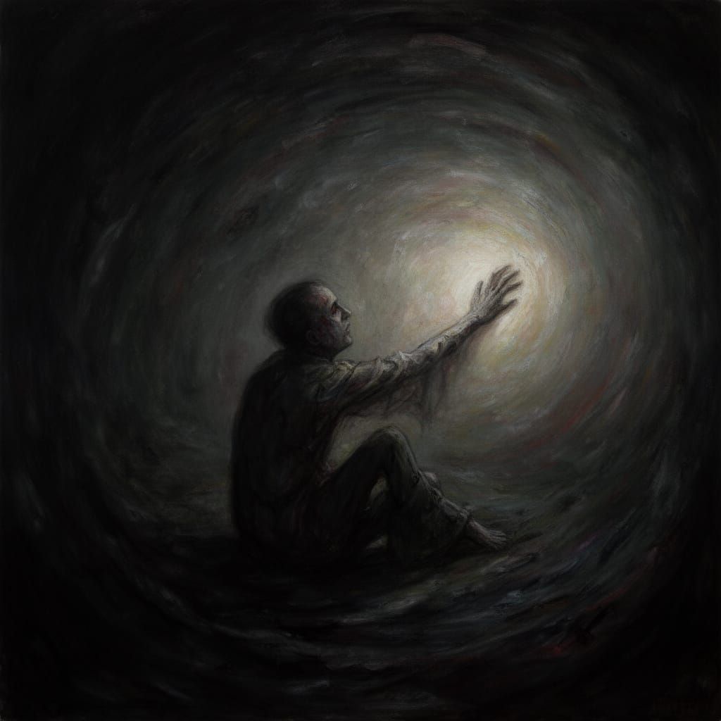 This image shows a lone figure in a dark, swirling vortex of shadows, reaching for light. Rendered in a surreal, atmospheric style with dramatic lighting and deep contrasts, it evokes profound despair.