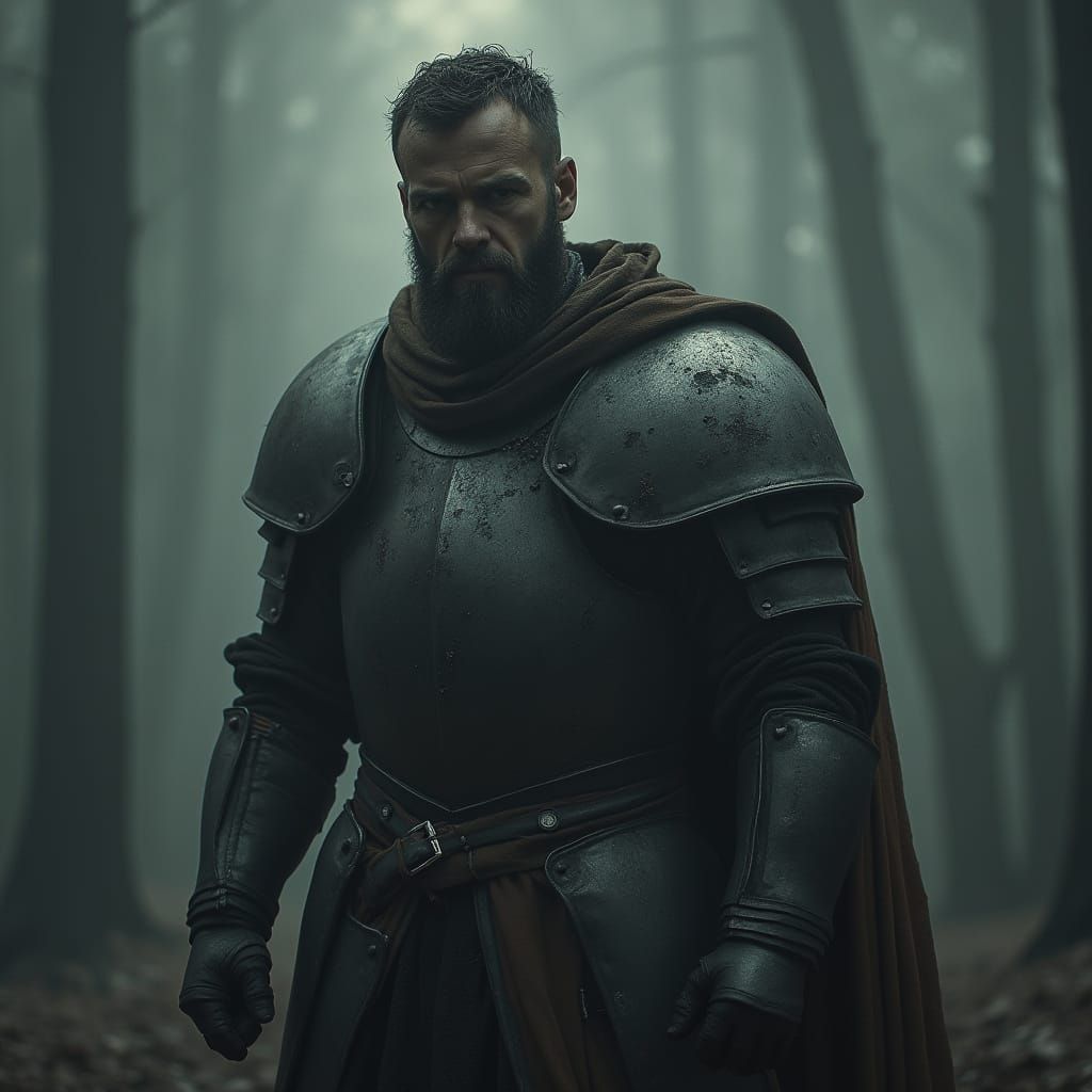 This image shows a lone warrior in battle-worn armor, standing firm against the enemy. The scene is reminiscent of film noir, with dramatic lighting and deep shadows in a gritty aesthetic.