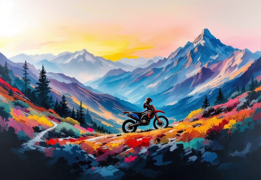 A vivid mountain scene with a motorcycle, painted with expressive brushstrokes and thick layers of watercolor that blend at the edges. The bottom fades to black in this dynamic, impressionist gouache style.
