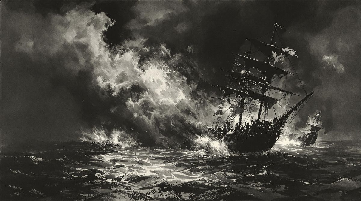 This charcoal drawing captures the intensity of a nighttime naval battle between a Spanish pirate ship and a British frigate. The artwork is characterized by smoky textures, strategic highlights, and expressive lines, creating a sense of drama and tension.