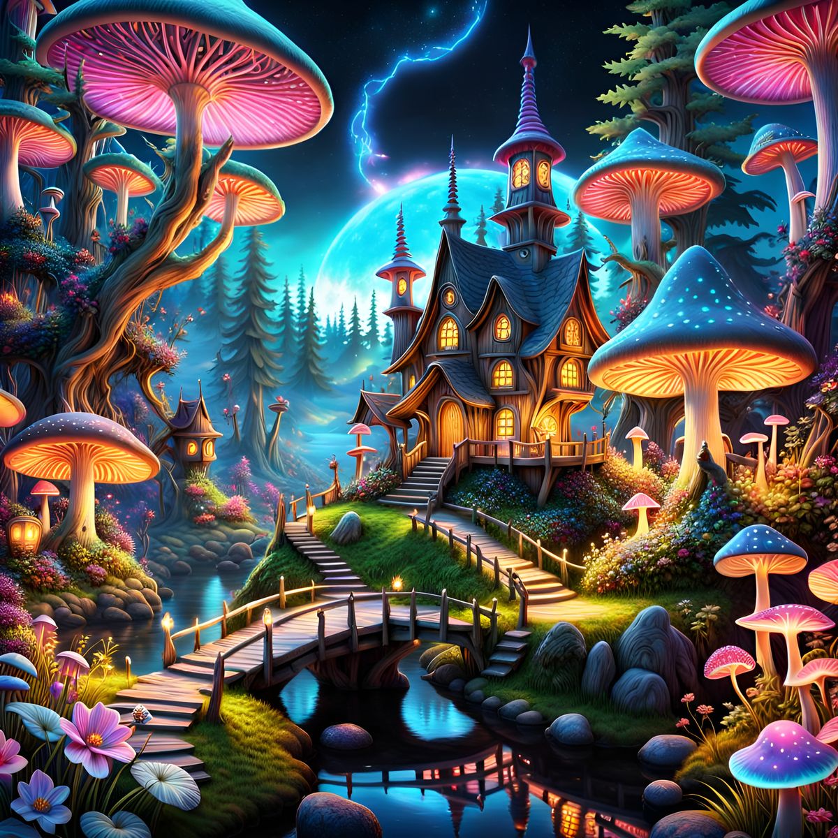 A vibrant image of a fairy village nestled in a bioluminescent mushroom forest. The fantasy scene features magical creatures, crystals, arcane auras, and intricate details, rendered as 3D digital art.