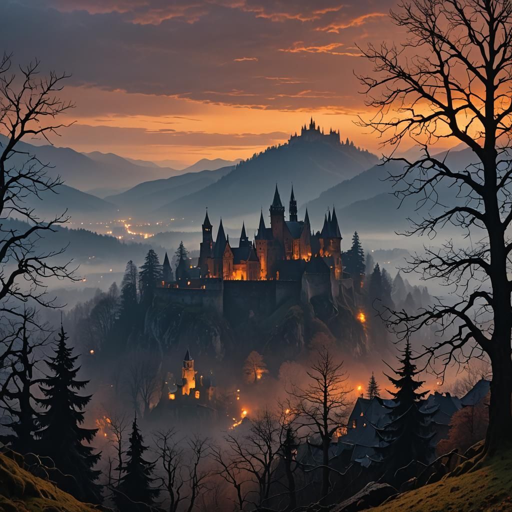 This image depicts Arthur Holmwood overlooking the Carpathian Mountains at dusk, with Dracula's castle visible. The scene features atmospheric mist, gnarled trees, and Gothic architecture, rendered with a sense of foreboding.