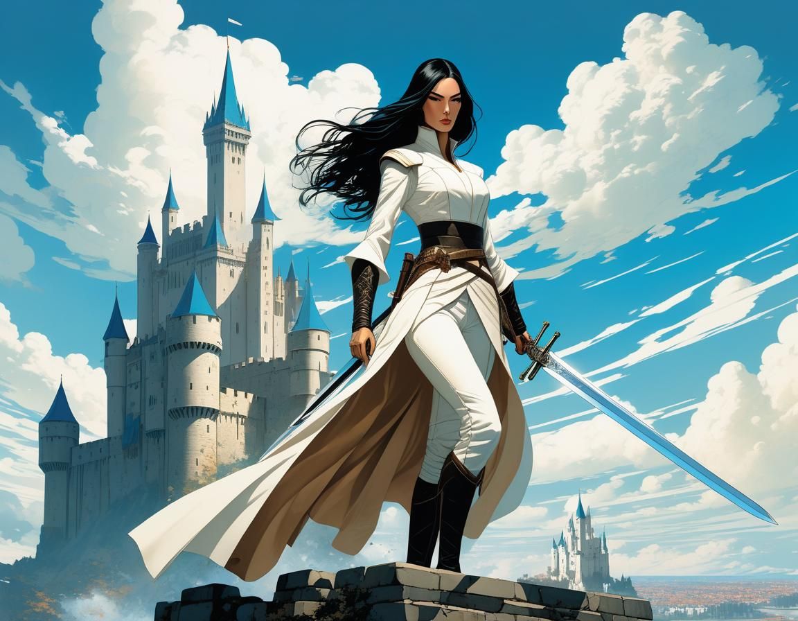 A striking picture of a beautiful female swordsman in flowing white and brown clothing. She wields a claymore against a backdrop of a castle and blue sky, rendered with digital aesthetics and intricate detail.