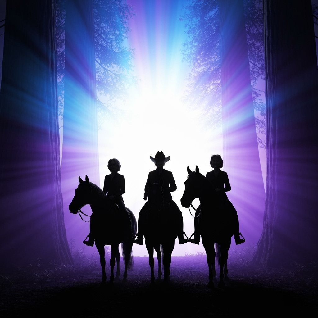 This 3D digital art showcases three women with elegant hairstyles riding horses through a redwood forest. The scene features a vibrant blue and purple gradient background and cinematic lighting.