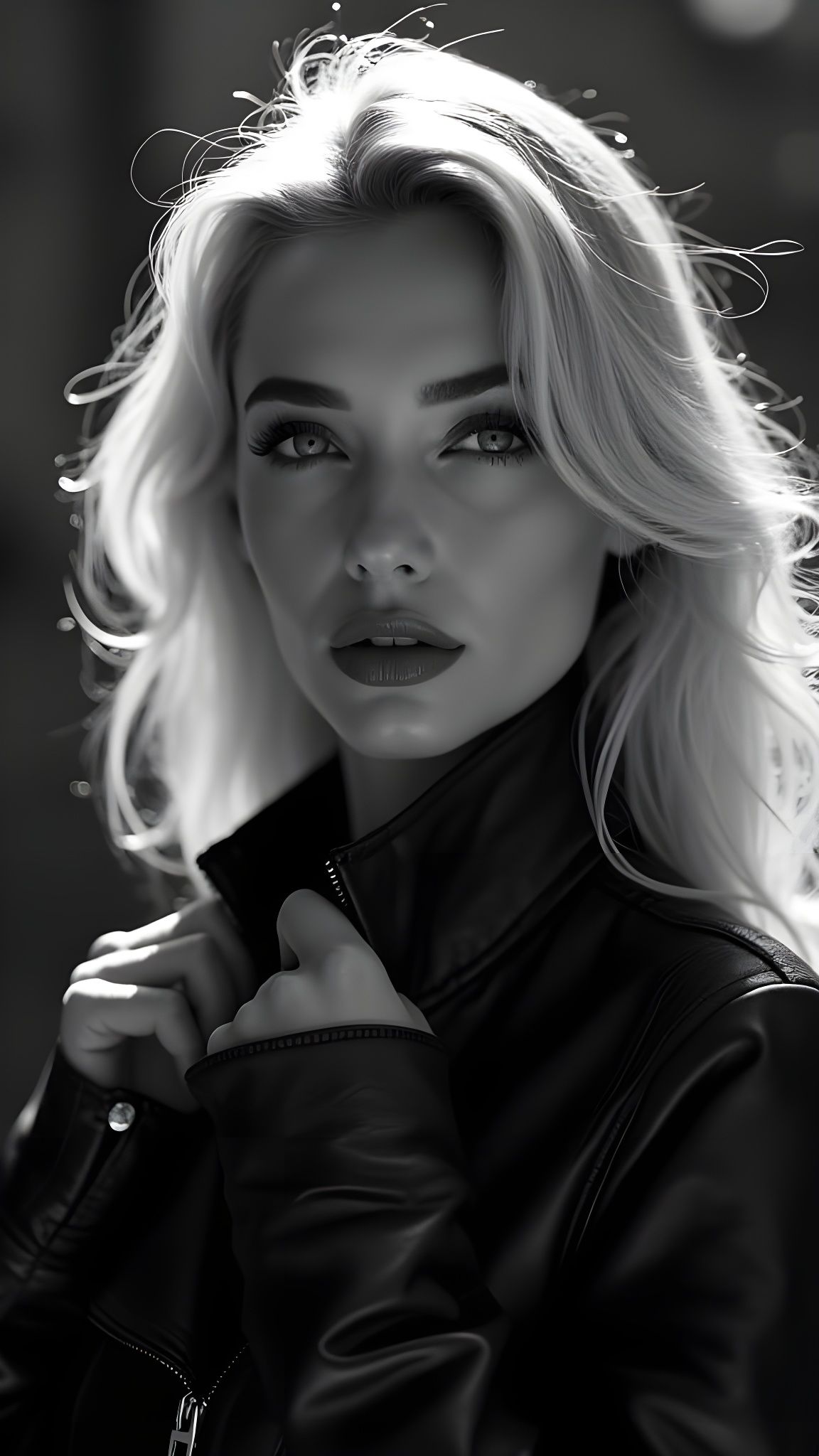 This hyperrealistic image captures a beautiful blonde woman in dramatic black and white. Her luminous hair and piercing eyes convey quiet intensity and seductive confidence, with a focus on tactile realism and cinematic depth.