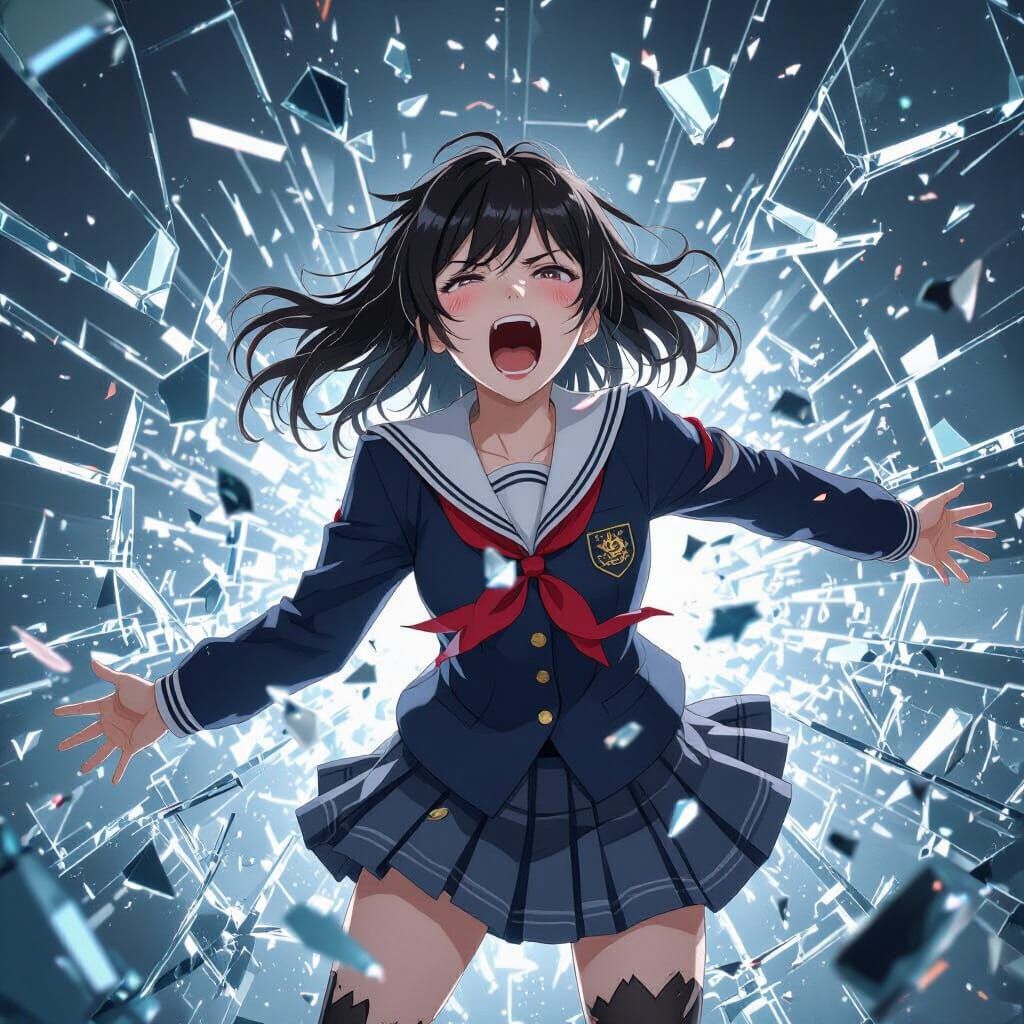This image shows a Korean girl in a torn uniform, screaming in distress amidst broken glass. It features a high-contrast, detailed aesthetic inspired by 3D anime styles.