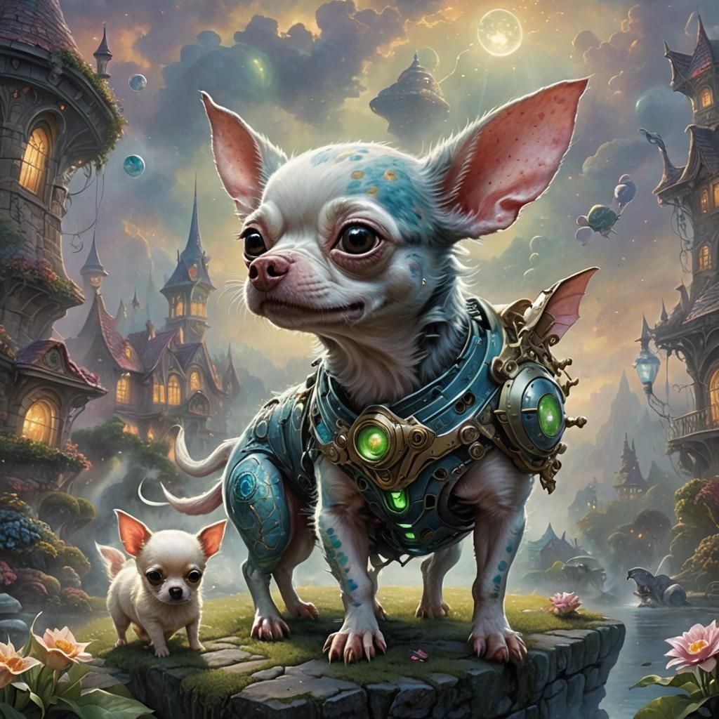 This image shows a bizarre alien hybrid. It combines the features of a pig and a chihuahua in a hyperdetailed ethereal fantasy, reminiscent of Thomas Kinkade's style.
