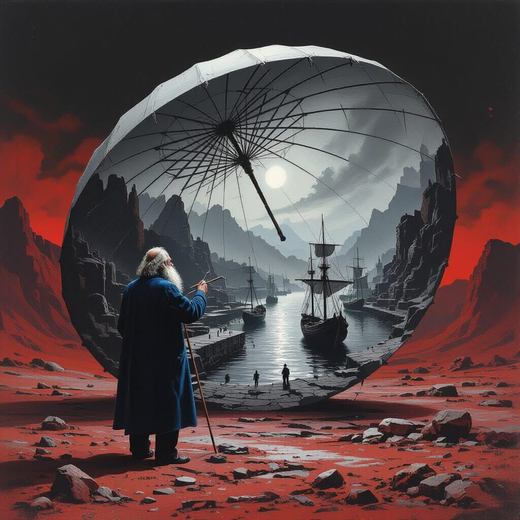 This image shows an old man painting a grayscale harbor scene inside an enormous, upturned parasol in a desolate mountain landscape. The artwork features stark contrasts and ethereal glows.