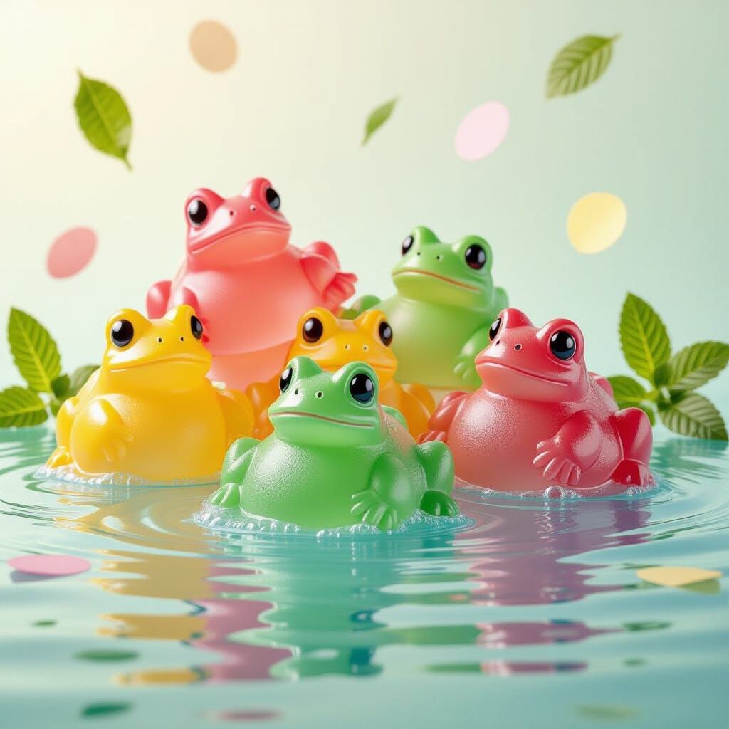 A vibrant image displaying colorful gummy frog candies in lime, strawberry, and blueberry flavors splashing onto a reflective surface, surrounded by mint and pastel confetti. The hyperrealistic scene features bokeh, high contrast reflections, and studio lighting.