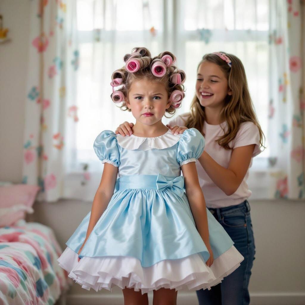 Oh Chris, I mean Cristina you look adorable in the dress I have handed down to you ! Your Curlers will come out in just 2 hours right in time for me to show you off to moms ladies book club. That gives u splenty of time to paint your nails ! Isn't being a girl so fun !!!