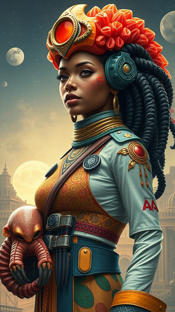 This image shows an Afrofuturist Starfleet officer in tribal attire. The gummy tardigrade golem alebrije is set against a solarpunk cybertopia in a massurrealist style.