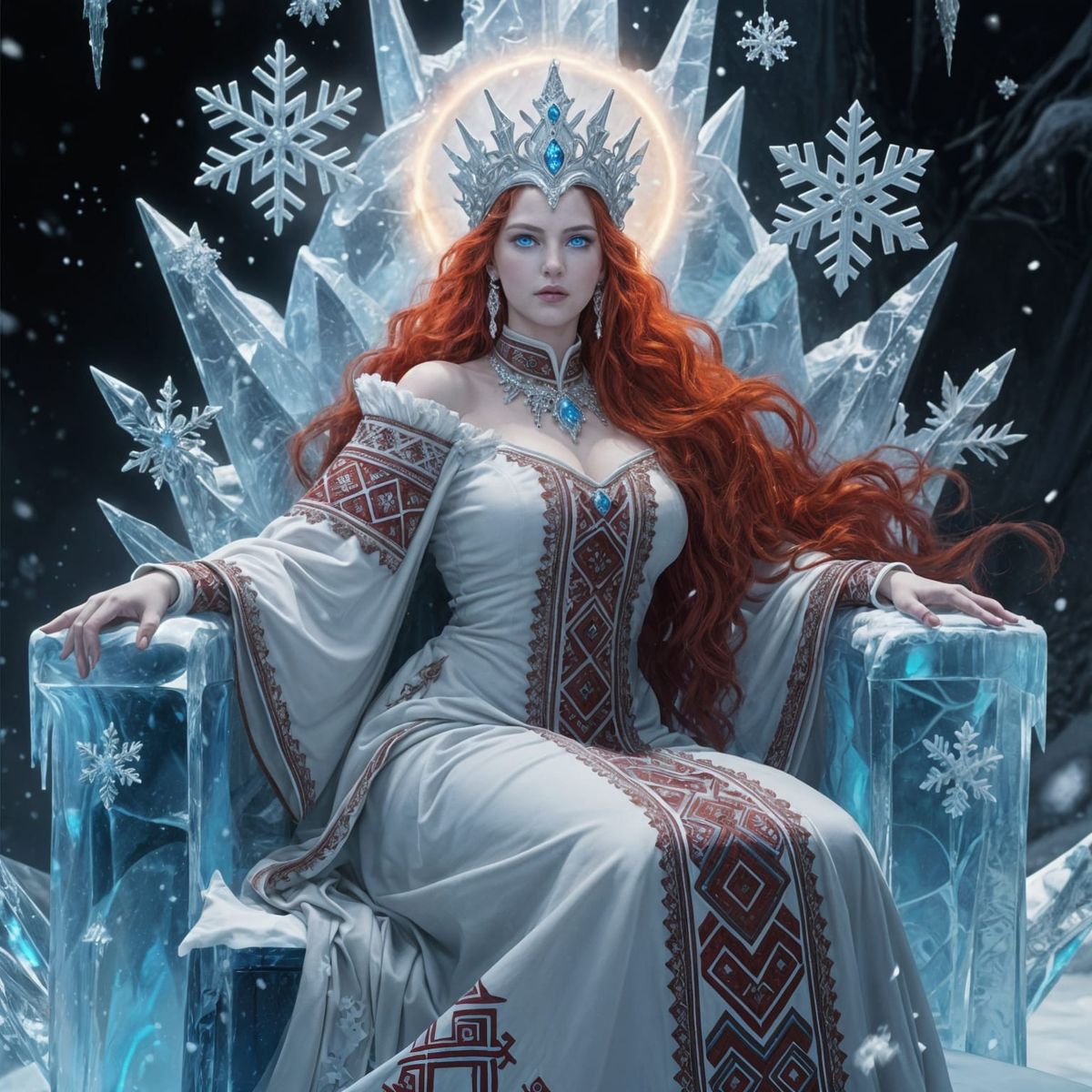 This image shows a beautiful snow queen with fiery red hair sitting on an ice throne. She is dressed in regal attire with Slavic embroidery, set in a throne room with snowflake patterns and ice crystals in a dark fantasy realism style.