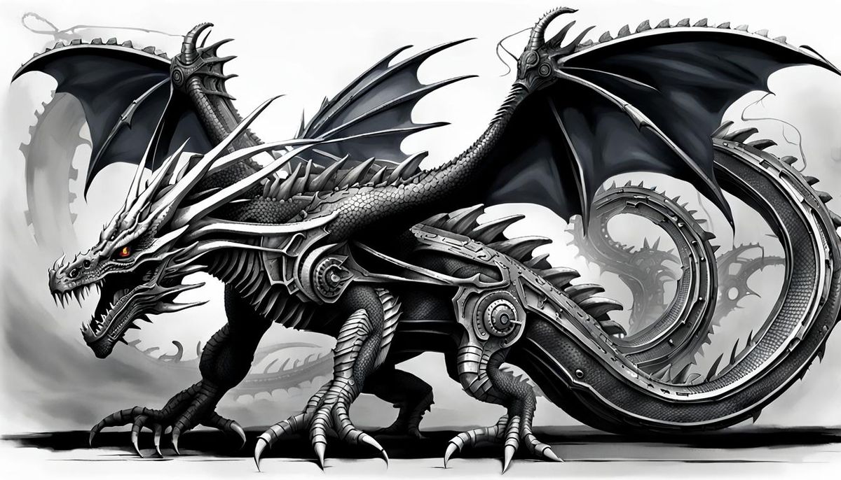 This image shows a biomechanical dragon ready for battle. The dragon features metallic armor and intricate mechanical details, creating a fusion of organic and artificial elements.
