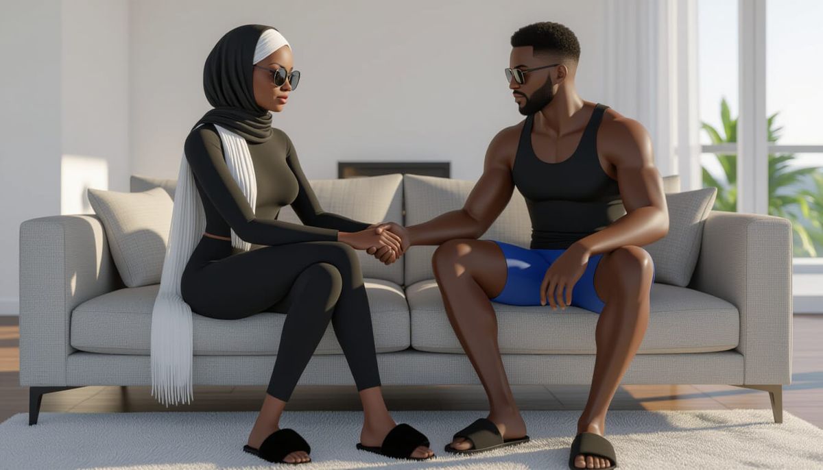 This image showcases a hyper-realistic animated style scene of an African woman and man holding hands while sitting on a couch in a luxurious house. Rendered with dramatic lighting and deep shadows.