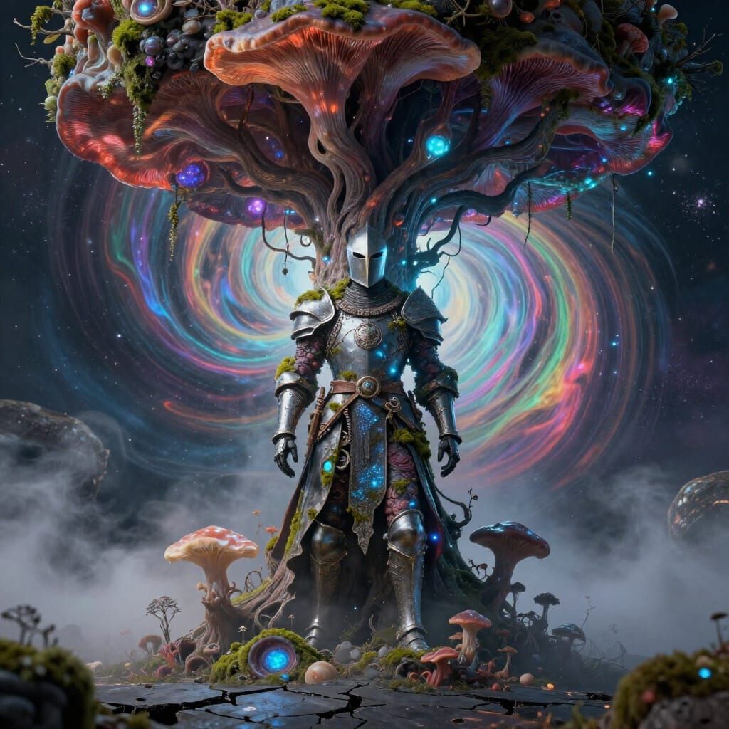 This image shows a knight made of glowing fungi and moss guarding an upside-down tree against a cosmic backdrop. Rendered with hyper-realistic textures and volumetric fog.