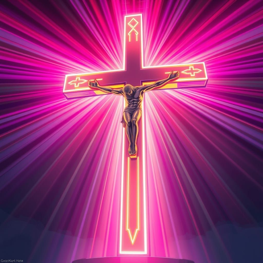 This image shows a neon Christian Cross radiating intense light in a dark room, reminiscent of digital artwork. It features bold lines and high contrast for a striking visual effect.