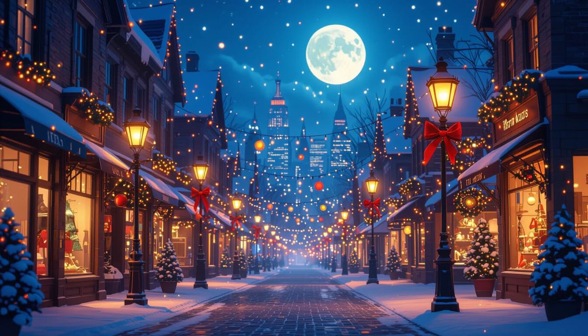 This image showcases a cozy metropolis Christmas shopping street adorned with decorations, warm lights, and old-fashioned lamp posts. Fantasy concept art style with ethereal lighting.