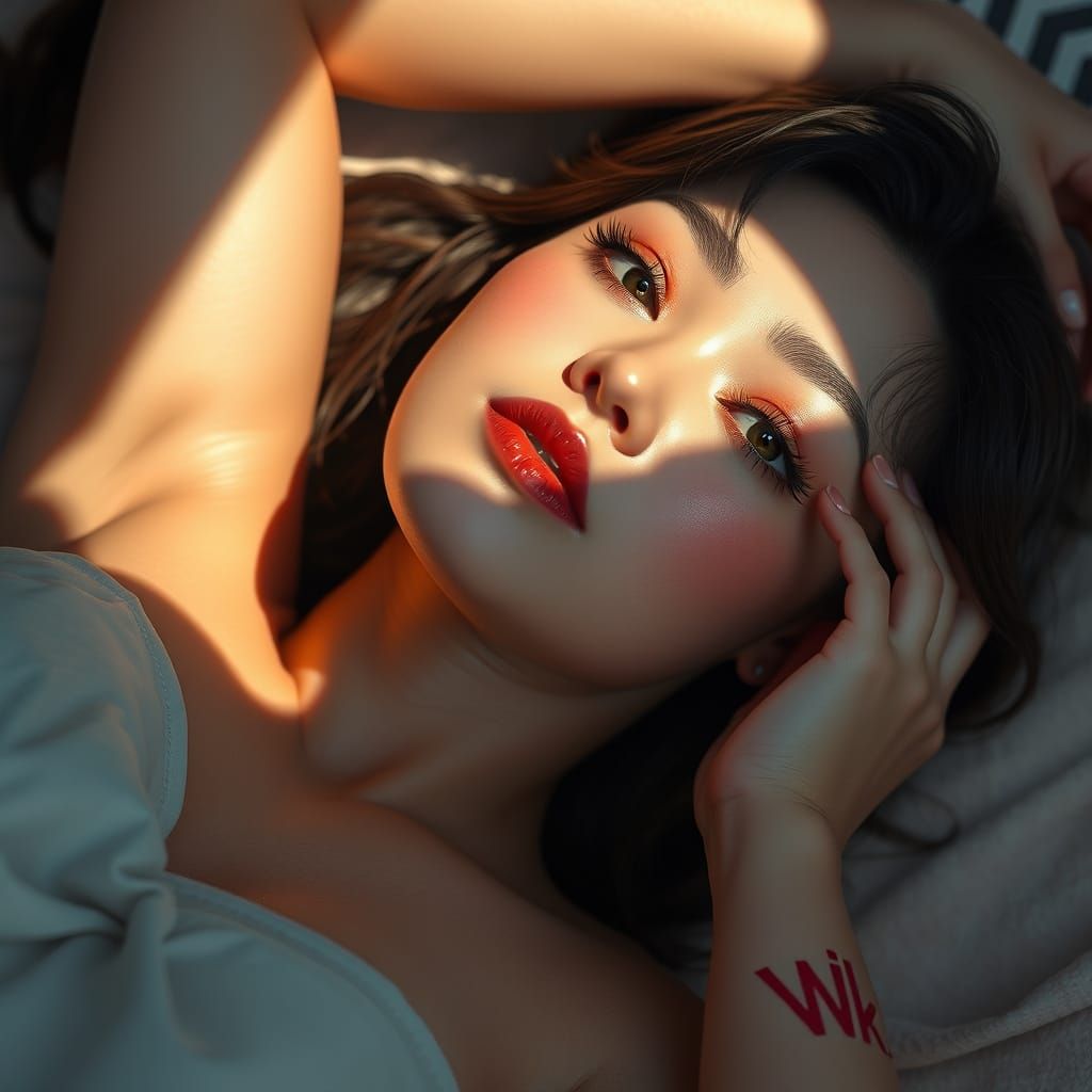 This image shows Yae Miko as a high-fashion model in an anime style. Her sweaty skin glistens under soft lighting, rendered with defined features and a delicate blush in vivid colors.