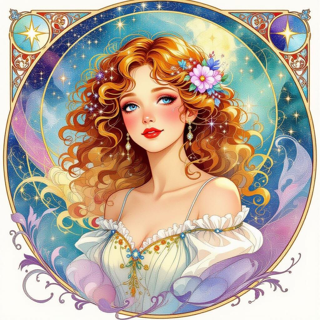 A dreamy watercolor image shows a celestial seamstress with stardust in her hair. She is surrounded by nebulae and celestial charts, stitching constellations with soft, ethereal light in an art nouveau aesthetic.
