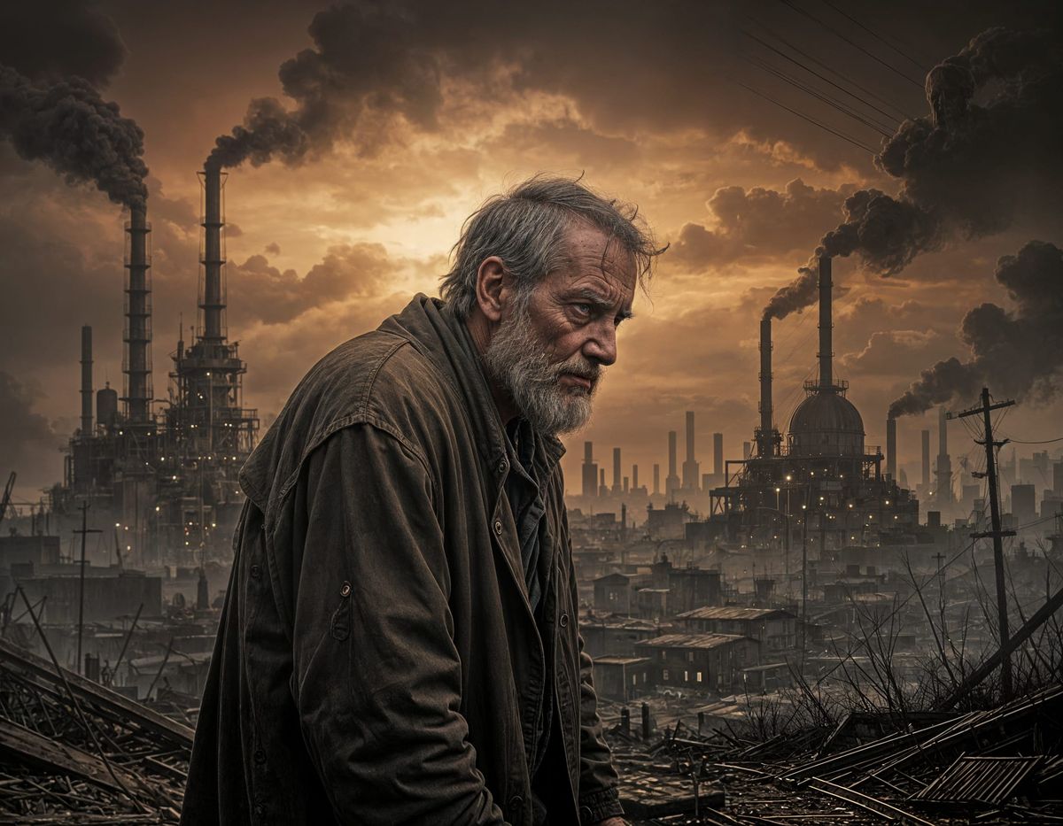 Create your own images of weary, depressed old men looking over industrial towns with our free AI image generator.