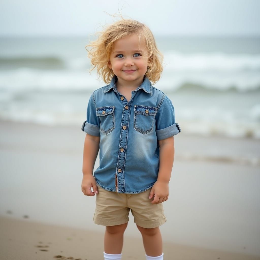 A realistic image of a happy two-year-old boy with blonde hair and blue eyes, standing barefoot on a sandy beach. The portrait captures fine details and textures with hyperrealism.
