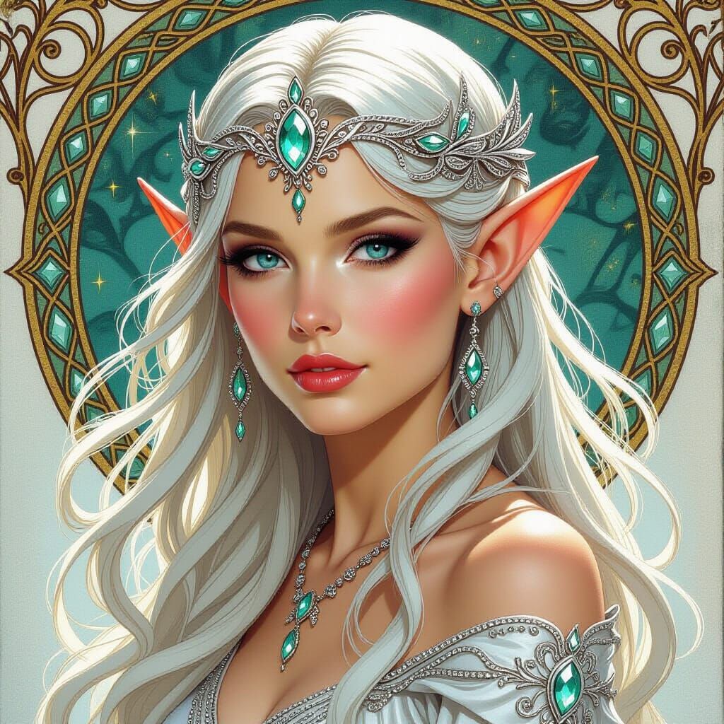 This image depicts a majestic female elf adorned with intricate silver headpiece and flowing hair. The style evokes fantasy art with shimmering gemstones and a mystical realism.