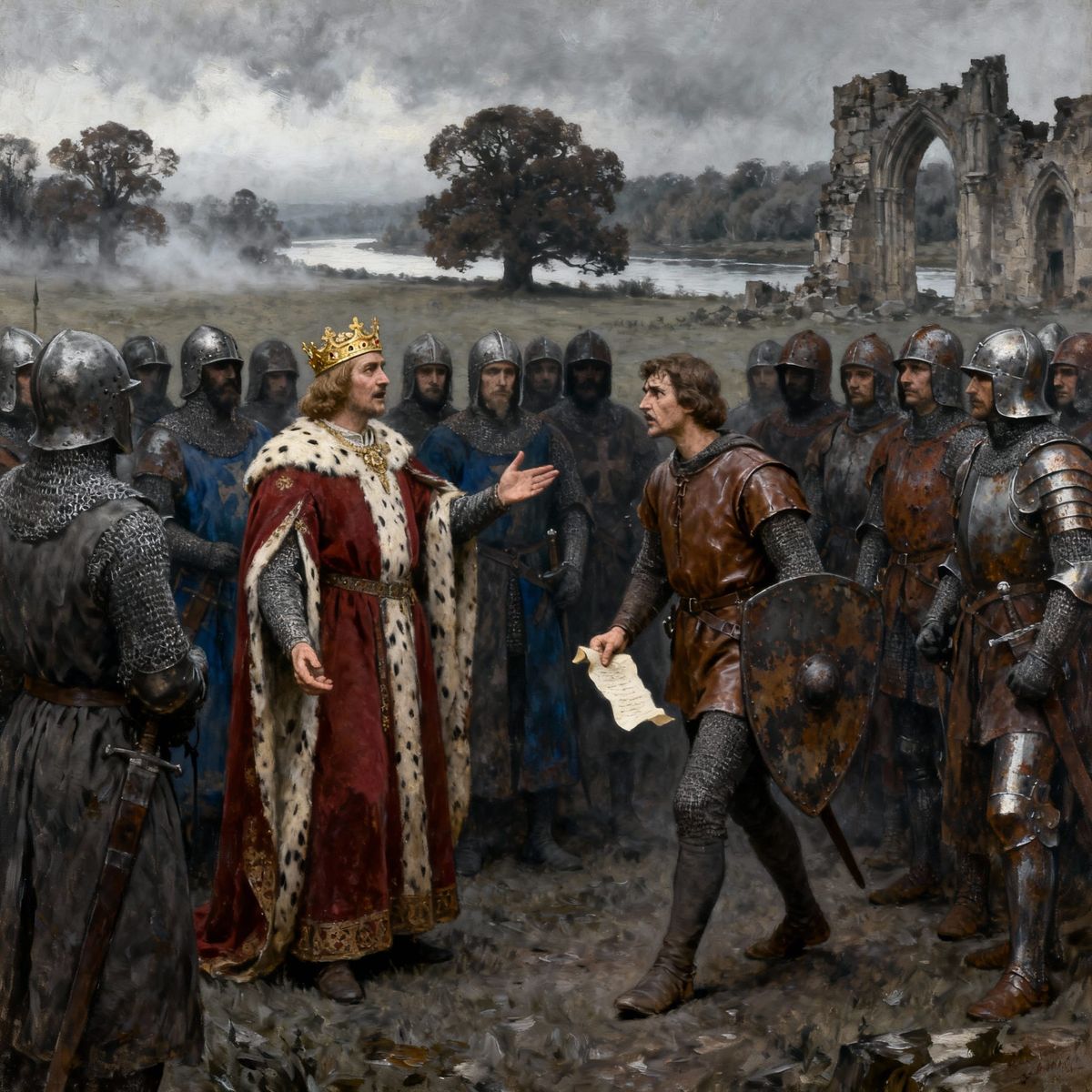 This image depicts King John discussing the Magna Carta with knights in a field. Rendered as a detailed historical oil painting with dramatic lighting and a somber palette.