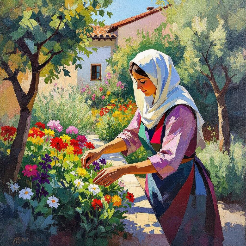 This image shows Strega Maria Angelina tending her vibrant herb garden. Rendered in an abstract cubism style with bold geometric forms and visible brushstrokes, evoking a sense of depth and texture.