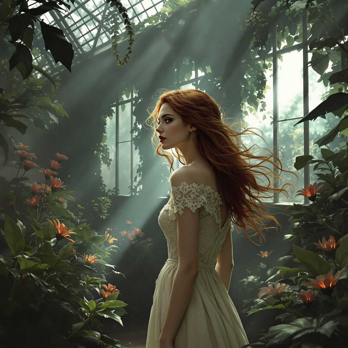 A solitary woman in a vintage gown stands in a misty Victorian greenhouse filled with exotic, glowing plants. The scene features soft light and an earthy color palette, evoking romantic and atmospheric environmental art.