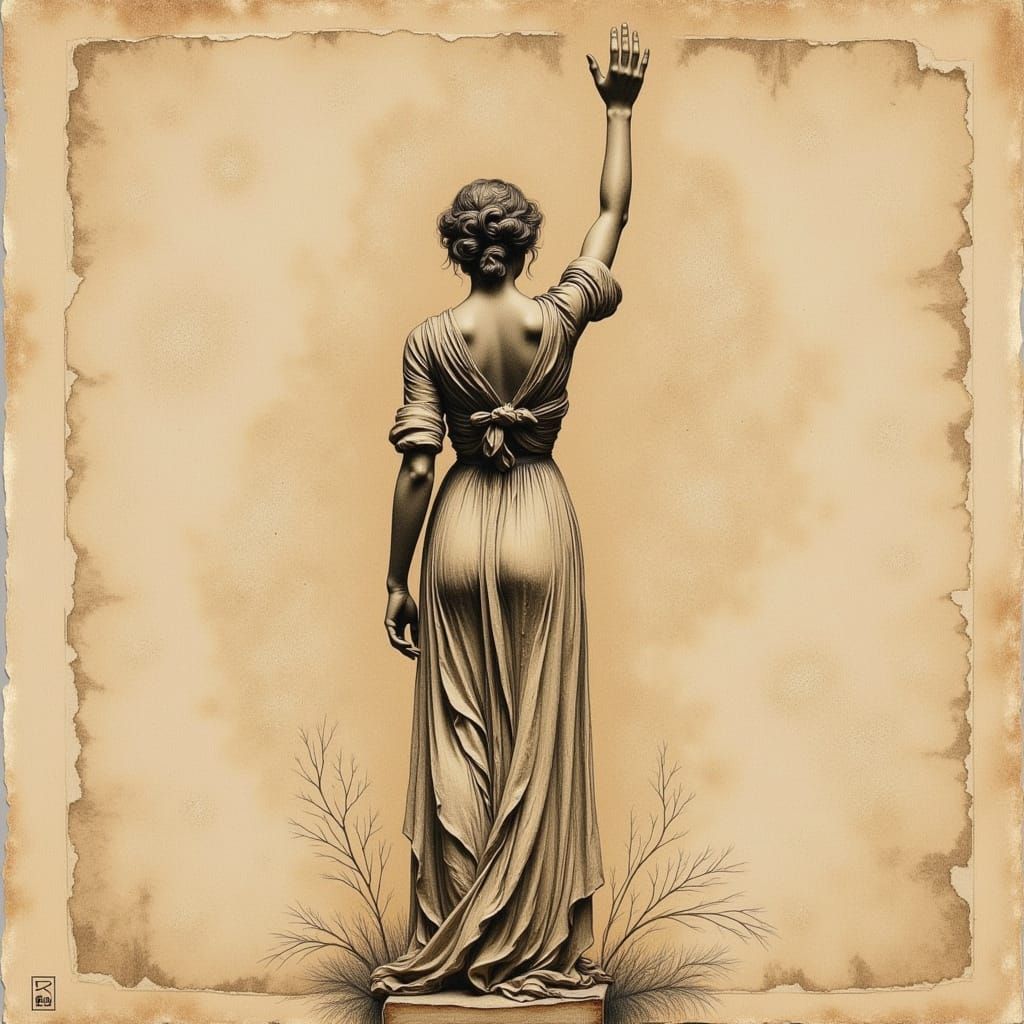 A sepia-toned mixed media collage showcases a classical statue of a woman in a vintage dress, viewed from behind. Her arm is raised, reaching upward in an elegant, nostalgic gesture, rendered with soft shading on textured paper.