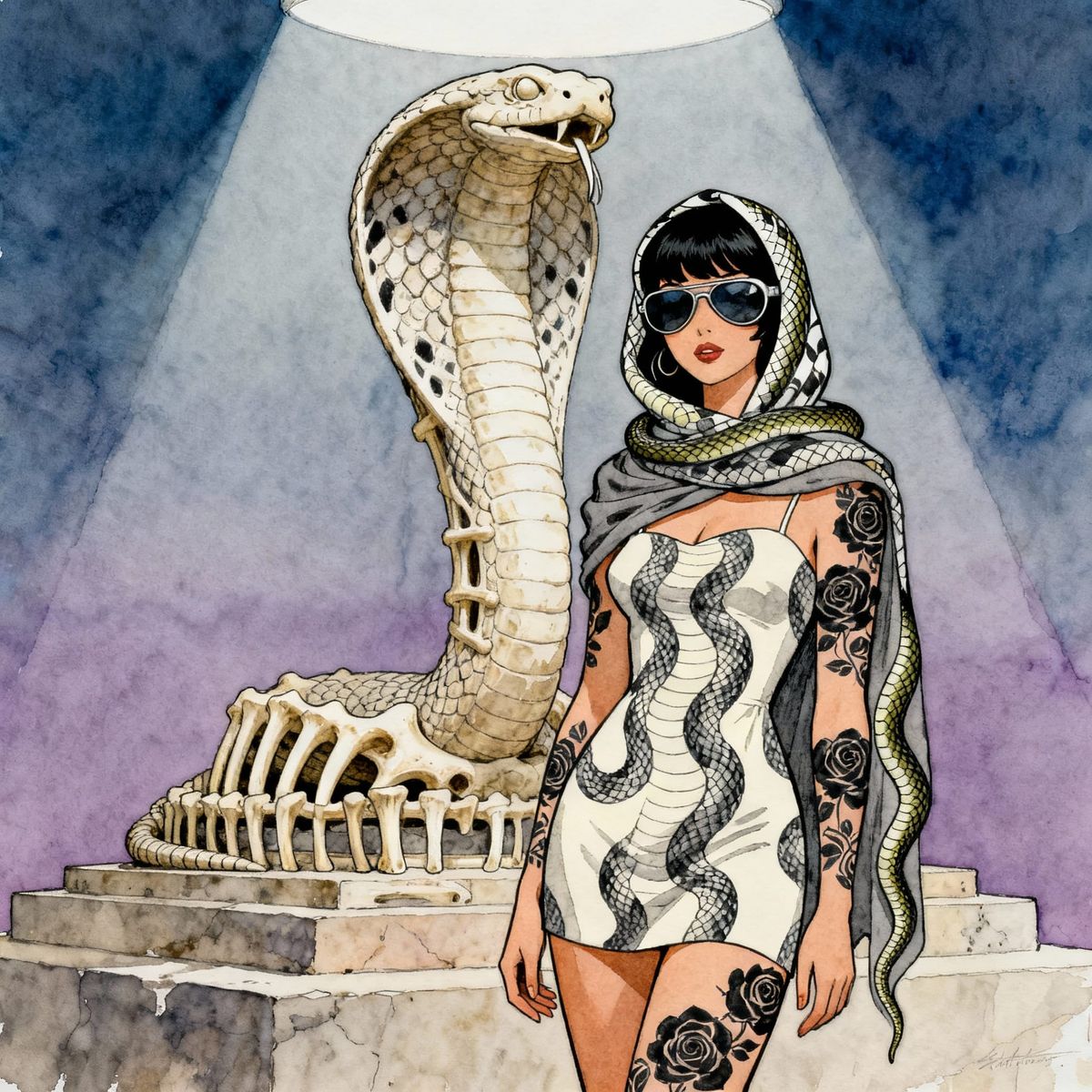 A limited-palette Saul Steinberg style ink-and-watercolour painting of a young woman (cobra-pattern off-white/charcoal sundress; eel-pattern headscarf and shawl; black-rose pattern full-body tattoos; black hair; aviator sunglasses) standing in front of cobra-statue made of elephant bones. Indigo/mauve/blue-grey ...