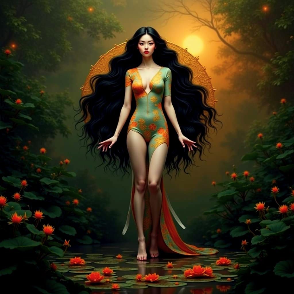 This image shows a hyperrealistic close-up portrait of a beautiful Geisha in a dense green forest, reflected in a mirror. She wears a colorful dress with golden motifs, set against a glowing cosmic background.
