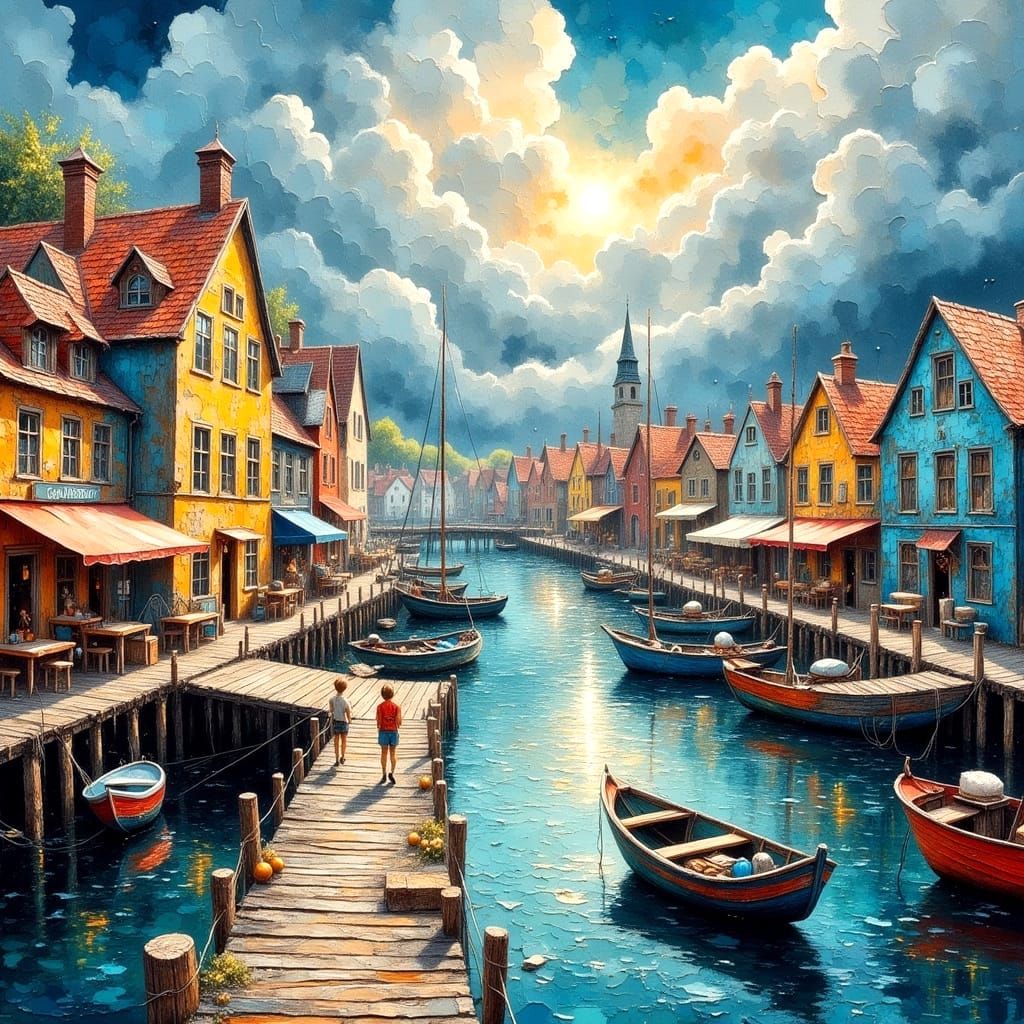 This image depicts a charming fishing village scene with a close-up of two children fishing off a wooden jetty, surrounded by colorful market stalls, whimsical houses, and old fishing boats. The atmosphere is filled with mist, sunrays, and a distant church spire, all captured in a textured, impasto oil p...