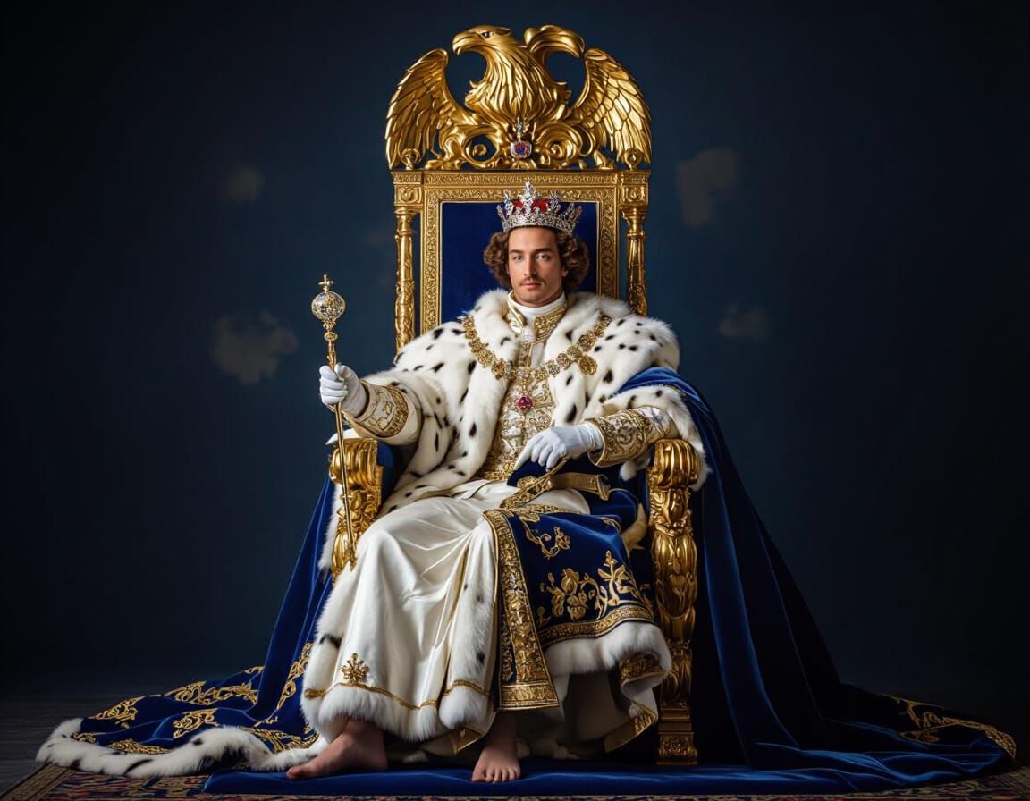 This image presents a young French Emperor regally posed on a golden eagle throne. A princess kneels to kiss his foot in this lavish scene, reminiscent of 18th-century French art.
