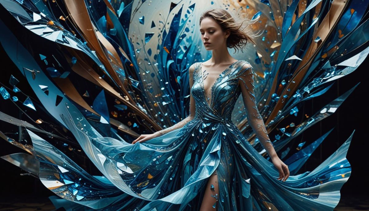 This image showcases a surrealist oil painting of a woman in an avant-garde dress crafted from shimmering glass shards. The haute couture design features iridescent hues and intricate detail, embodying sustainable innovation.