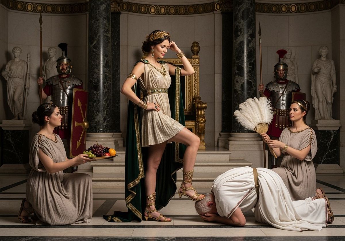 This image shows Empress Messalina in her opulent throne room, attended by servants and Roman legionnaires. A senator bows before her as she looks on with contempt. The scene evokes classical Roman opulence.