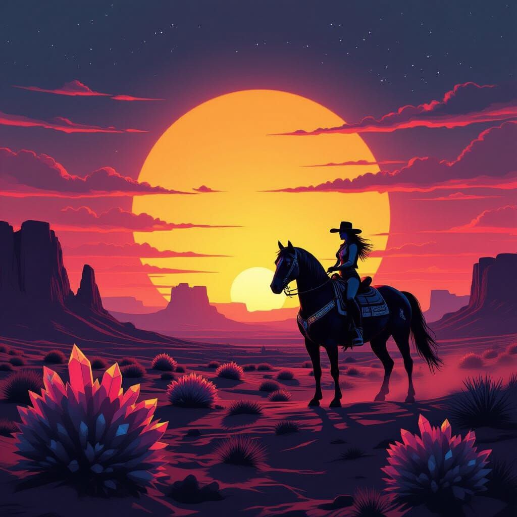 A lone cowgirl rides a glowing alien horse across a vast, arid planet under a double sunset, featuring crystalline plants and cinematic lighting. Evokes adventure and vastness.